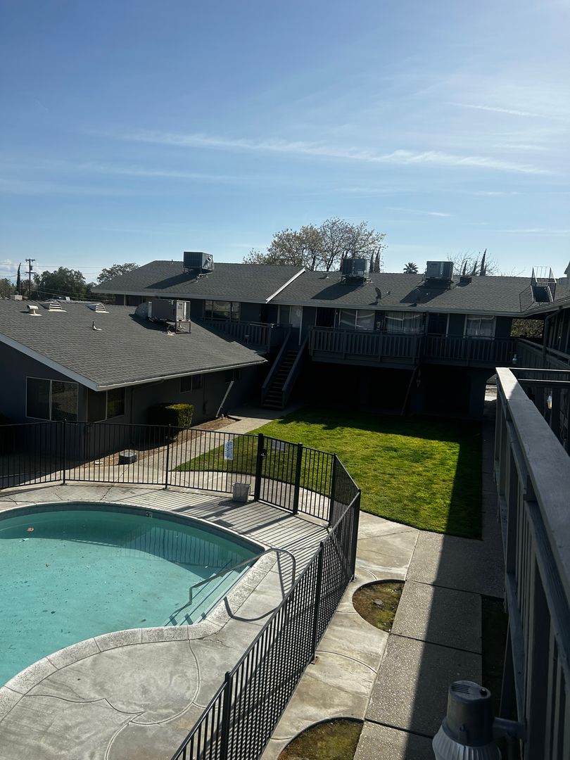 2 Bedroom, 1 Bath apartment in Fresno, CA, featuring central heating and A/C and an electric stove. This downstairs unit includes a refrigerator, on-site laundry facility and a private backyard patio. Residents have access to a shared community pool and benefit from an on-site manager for convenient support. The layout provides two bedrooms and one bathroom with practical amenities for comfortable living.